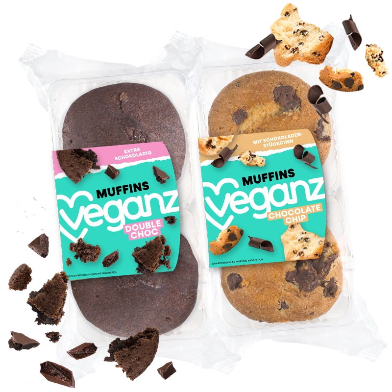 Chocolate Chip Muffins Double Choc Muffins Are you in the mood for vegan muffins, but your baking skills leave something to be desired? Never fear! Our Veganz Chocolate Chip Muffins are here! You don't have to be a master pastry chef or pâtissier to enjoy them: Fluffy, moist, crunchy chocolate chips and ready to eat any time. Oh yes, sweet delights have never been this easy! Ingredients Sugar, wheat flour, rapeseed oil, chocolate chips (11%) (sugar, cocoa mass, cocoa butter, strongly de-oiled cocoa, emulsifier: sunflower lecithin), wheat starch, humectant: glycerine; raising agents: diphosphates, sodium carbonates; natural flavouring, wheat gluten, salt, potato protein, emulsifier: sunflower lecithin; thickener: sodium alginate. Cocoa: 40% min. chocolate. 🛈 Available here shop.staging.veganz.com Puroshop | CZ Rohlik | CZ Lidl | CH AEZ / HIT | DE REWE | DE kokku-online.de | DE Globus | DE Spar | SI Amazon Fresh Vekoop | DE Lidl | DE ALDI SÜD | DE EDEKA | DE MPREIS | IT Show more Luke and Leia, Fred and George Weasley, the Veganz Double Choc Muffins – Twins that have that special something. Some are exceptionally powerful, others magically cheeky, while our two vegan chocolate muffins are extra fluffy, moist and chocolaty. Where do they get their double-chocolate power from? Crunchy chocolate pieces and lots of cocoa in the batter. What a dreamteam! Ingredients Sugar, rapeseed oil, wheat flour, chocolate chips (11%) (sugar, cocoa mass, cocoa butter, strongly deoiled cocoa, emulsifier: sunflower lecithin), wheat starch, humectant: glycerine; cocoa strongly defatted (3,5%), raising agents: diphosphates, sodium carbonates; natural flavouring, wheat gluten, salt, potato protein, emulsifier: sunflower lecithin; thickener: sodium alginate. Cocoa: at least 40%. May contain traces of nuts, egg and milk. 🛈 Available here shop.staging.veganz.com Puroshop | CZ Rohlik | CZ Lidl | CH AEZ / HIT | DE REWE | DE kokku-online.de | DE Globus | DE EDEKA | DE coop | CH Spar | SI Amazon Fresh Vekoop | DE Lidl | DE ALDI SÜD | DE MPREIS | IT Show more