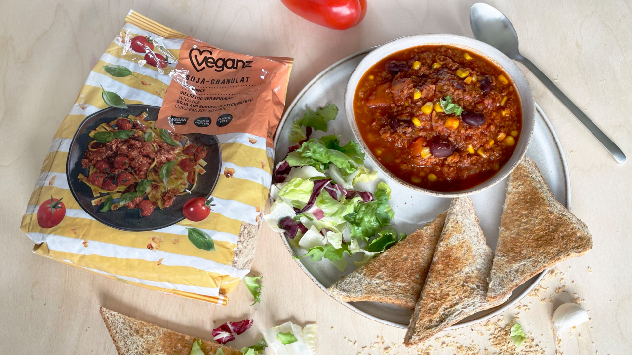 Chili sin CarneWith Veganz Soy Mince In need of something quick and easy that doesn’t leave you with lots of washing-up? In that case, our vegan Chili sin Carne made in a single pot with Veganz Soy Mince will be the perfect meal for you! Enjoy it with fresh bread, rice, or just on its own: you’re sure to love this simple yet delicious recipe. One-pot Meals Known as one-pot meals, they’re great when you’re in a hurry or simply don’t fancy doing loads of washing-up after dinner. Pasta or rice dishes are perfect for one-pot meals, but you can just as well make an aromatic chili in a single large pot. Take a look at the following recipe to find out how to make an alternative to Chili con Carne with our high-protein Veganz Soy Mince. The alternative to meat boasts as much as 50 g of protein per 100 g. That’s 30 g more protein than in conventional minced beef. In terms of sustainability, Veganz Soy Mince is just as much of a high achiever. The large 500 g packet causes just 1,207 g of carbon emissions and requires 7 litres of water. Take a look at this comparison: the same amount of minced beef requires nearly 8,000 litres of water and causes 5 kg of carbon emissions! Ingredients (4 Serves) 200 g Veganz Soy Mince 500 g puréed tomatoes 400 g chopped tomatoes 400 g kidney beans 285 g sweetcorn 1 large onion 2 garlic cloves Oil, for frying 500 ml vegetable broth 1 tbsp tomato purée 1 tsp salt 1 tsp pepper 1 tbsp paprika powder 1 tsp chili powder Bread or rice if you fancy Portions Serves: Finely chop the onion and garlic and sauté them in a little oil until they become translucent. Add the Veganz Soy Mince, tomato purée, and the paprika powder and fry. Quench with the vegetable broth. Now add the puréed tomatoes and the chopped tomatoes and leave the Chili to come to the boil. Stir in the sweetcorn, kidney beans and the remaining seasoning and leave your Chili sin Carne to simmer for 20 minutes. If you’re serving the dish with rice or bread, this is the time to prepare it so it’s ready to serve with the Chili sin Carne. Bon appetit! Unsere Produkte für deine Rezeptkreation