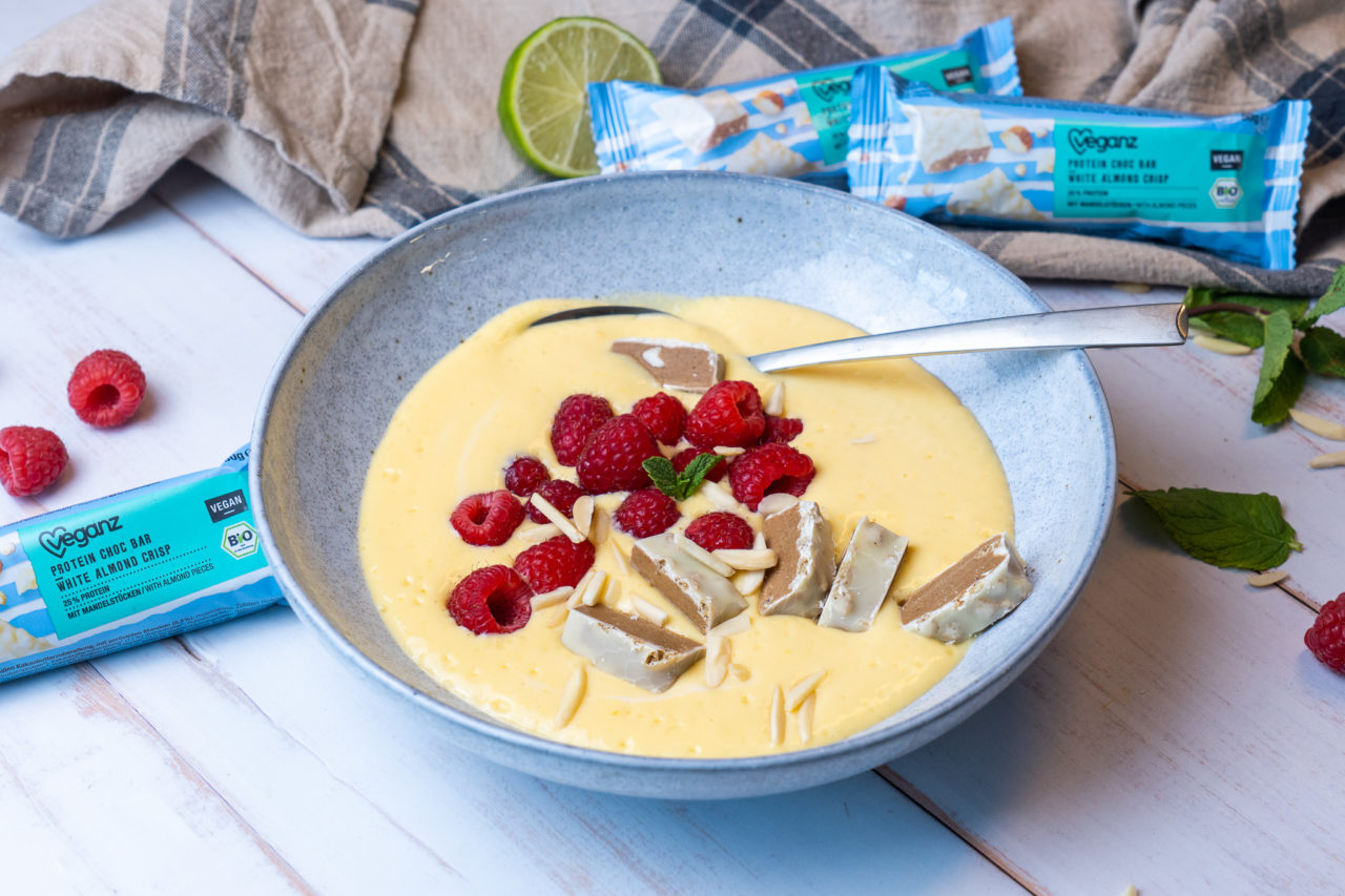 Vegan Mango Smoothie Bowl with White Almond Crisp ToppingWith the Organic Veganz Protein Choc Bar White Almond Crisp How about it? Have you had breakfast yet? If you need that extra boost of energy (in the morning), let us present a quick recipe for a vegan Mango Smoothie Bowl topped with the Veganz Protein Choc Bar White Almond Crisp. Energy to go with vegan protein Our protein bar on its own and the combination with fruity mango-coconut-yoghurt are the perfect companions when you’re on the go. The vegan Mango Smoothie Bowl is really quick and simple to make and is sure to give your lunch box that special kick! So creamy, so fruity, and oh so tasty. And the best thing: it’s a really satiating meal! Made with a mix of rice, pea, soya, and pumpkin seed protein, our Protein Choc Bar White Almond already provides a good portion of the good stuff. Just look beneath the surface of its crispy outer to discover the almonds and protein rice crispies. Add to that the versatile fruity yoghurt bowl, fresh raspberries, and even more almonds, and you’ve landed yourself a proper power pack in a bowl! Where to get hold of our Organic Veganz Protein Choc Bar White Almond Crisp Luckily, there are already a lot of places where you can get your hands on our protein bar to sweeten both your day and the Smoothie Bowl! Among the stockists are, e.g., Edeka, Rossmann, dm, Müller, and many other shops. For a full list, please look here. If you still struggle to find any when you’re out shopping, we’d encourage you to submit our Wish List to your local shop. Ingredients (1 Person) 200 g vegan natural coconut yoghurt 150 g frozen mango 1 tbsp maple syrup ½ lime (juice) 1 Veganz organic Protein Choc Bar White Almond Crisp 60 g raspberries 1 tbsp almond slivers mint to taste Portions Person: Got everything ready? Let's go! Place the vegan alternative to yoghurt, frozen mango, maple syrup, and juice of half a lime in the blender and purée until creamy and smooth. Pour into a bowl. Cut the Veganz Protein Bar into bite-sized pieces and wash the raspberries. Use them to garnish your puréed Mango Smoothie Bowl. Finish off the topping with some almond slivers and fresh mint. Bon appetit! Unsere Produkte für deine Rezeptkreation Quelle Recipe from: Hier kocht Alex Alexander Flohr, better known as "Hier kocht Alex" is not exactly the prototype vegan considering he is a master road builder. As a YouTuber, cookbook author, and TV chef, he shows with his recipes that you don’t have to do without as a vegan. From Königsberger meatballs to Soljanka, he brings well-known classics to the table in a purely plant-based version! Source: Hier kocht Alex Copyright: Hier kocht Alex