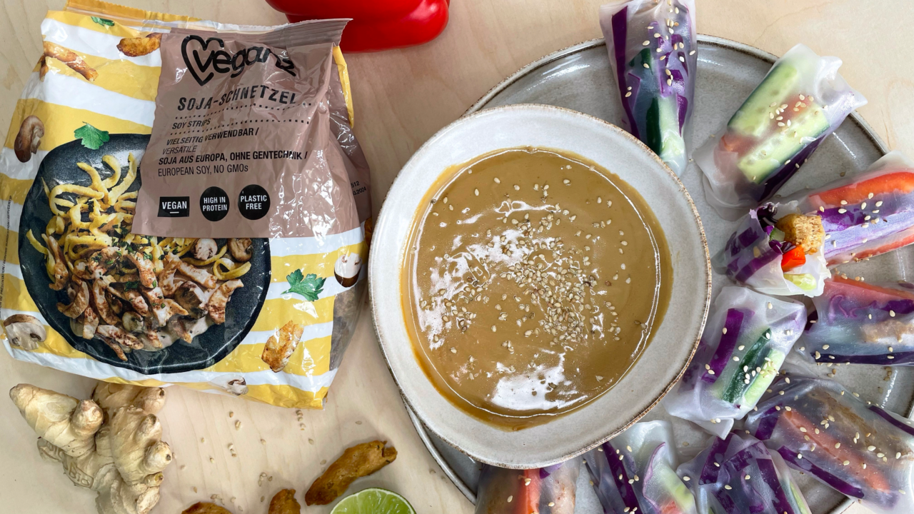 Vegan Summer Rolls with Peanut Butter SauceWith Veganz Shredded Soy The ideal summer food? The name says it all: Vegan Summer Rolls with Peanut Butter Sauce. Filled with crunchy veggies and delicate Veganz Shredded Soy, these rolls are just the thing on a hot day since you can eat them cold and they’re packed with fresh ingredients. Whether you’re planning a picnic in the park, an evening with friends, or just a snack: this traditional Vietnamese treat is perfect any time. To round it all off, just dip the vegan starter in a creamy homemade peanut butter sauce. Spring Roll vs. Summer Roll You’re sure to already know deep-fried spring rolls from your favourite Asian outlet, but what are summer rolls? Rather than being wrapped in a special filo pastry, summer rolls are wrapped in rice wafers soaked in water. It makes them much lighter to eat than their deep-fried counterparts and they’re a lot easier to digest. And since they’re served cold, summer rolls are definitely the perfect summer food. Take a look at our recipe to find out how to quickly mix up a fantastic peanut butter sauce as a dip or simply dip them in soya sauce or any other dip that takes your fancy. Preparing Vegan Summer Rolls To make summer rolls, simply place your choice of fresh ingredients on a rice wafer and make it into a roll. Fill the roll with your favourite ingredients, e.g., rice noodles and salad as the base. Then, veggies and herbs like carrots, cucumber, mango, bean sprouts, coriander, and basil all add up to a perfect Asian snack. The non-vegan variety is often filled with meat, fish, or prawns. In contrast, the vegan ones are excellent with duck fillet-style tofu or seitan, although our recipe uses crisp fried Veganz Shredded Soy instead. When compared to 100,000 other products, our Shredded Soy requires very little water, only creates a small amount of CO2, and it’s even grown nearby on the Danube in Serbia. As such, by enjoying these vegan summer rolls, you’ll be protecting animals, the climate and the rainforest! Ingredients (2 Serves) For the summer rolls 100 g Veganz Shredded Soy 15 Rice wafers ¼ red cabbage ½ cucumber 1 pepper 1 tbsp sesame seeds Oil, for fying 500 ml vegetable broth For the peanut butter sauce 70 g peanut butter 1 tbsp soya sauce 1 tbsp coconut blossom sugar 1 garlic clove fresh ginger ½ tbsp rice vinegar 2 tbsp coconut milk Juice of half a lime 3 tbsp Water Portions Serves: Pour 500 ml of boiling vegetable broth over the Veganz Shredded Soy and leave to marinate for 10 minutes. Then squeeze the liquid out of the Shredded Soy and fry it in a little oil in a pan until hot and crispy. In the meantime, cut the red cabbage, cucumber, and pepper into long strips. Dunk the rice wafers into water for a moment before filling them with the cooled Shredded Soy and a little sesame. To seal the summer rolls, it’s best to place the ingredients in the middle, then fold the ends over and carefully roll up the rice wafer lengthwise. For the peanut butter dip, finely chop the ginger and garlic and mix them with all the other ingredients until you’re left with a creamy mixture. Garnish with a little sesame and then simply dunk the vegan summer rolls and enjoy. Unsere Produkte für deine Rezeptkreation