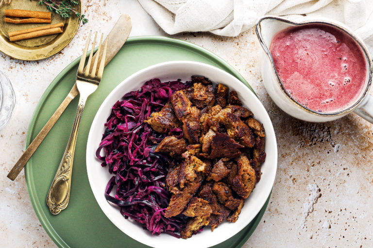 Apple red cabbage with crispy vegan duck and cranberry sauce